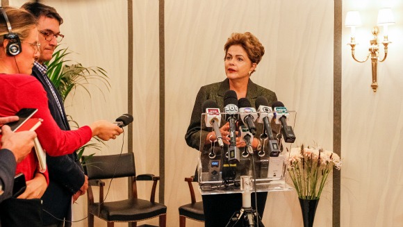 Dilma afirmou que o Brasil tem de buscar “sistematicamente um ambiente de entendimento, de diálogo e paz” na política, e “alcançar uma estabilidade política baseada em uma visão de que interesses partidários e pessoais têm de ser colocados abaixo dos interesses do País”.