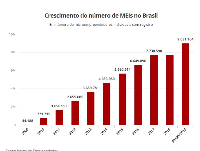 Segundo dados do Portal do Empreendedor do governo federal, o número total de registros de MEIs atingiu 9,031 milhões no final de setembro, o que representa uma alta de 16,7% na comparação com o final do ano passado (7,74 milhões) e de 21,6% em 12 meses (no final de setembro de 2018 eram 7,42 milhões).