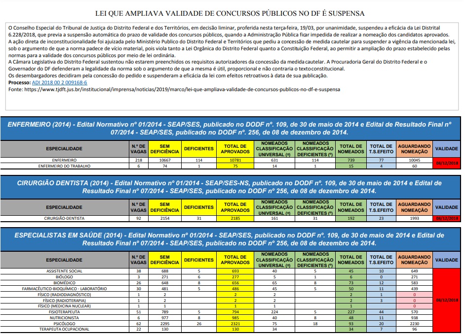 O Conselho Especial do Tribunal de Justiça do Distrito Federal e dos Territórios, em decisão liminar, proferida nesta terça-feira, 19/03, por unanimidade, suspendeu a eficácia da Lei Distrital 6.228/2018, que previa a suspensão automática do prazo de validade dos concursos públicos, quando a Administração Pública ficar impedida de realizar a nomeação dos candidatos aprovados. A ação direta de inconstitucionalidade foi ajuizada pelo Ministério Publico do Distrito Federal e Territórios que pediu a concessão de medida cautelar para suspender a vigência da mencionada lei, sob o argumento de que a norma padece de vício material, pois viola tanto a Lei Orgânica do Distrito Federal quanto a Constituição Federal, ao permitir a ampliação do prazo estabelecido pelas normas para a validade dos concursos públicos por meio de lei ordinária. A Câmara Legislativa do Distrito Federal sustentou não estarem preenchidos os requisitos autorizadores da concessão da medidacautelar. A Procuradoria Geral do Distrito Federal e o Governador do DF defenderam a legalidade da norma sob o argumento de que a mesma é útil, proporcional e não contraria o textoconstitucional. Os desembargadores decidiram pela concessão do pedido e suspenderam a eficácia da lei com efeitos retroativos à data de sua publicação. Processo: ADI 2018 00 2 009168-6 Fonte: https://www.tjdft.jus.br/institucional/imprensa/noticias/2019/marco/lei-que-ampliava-validade-de-concursos-publicos-no-df-e-suspensa