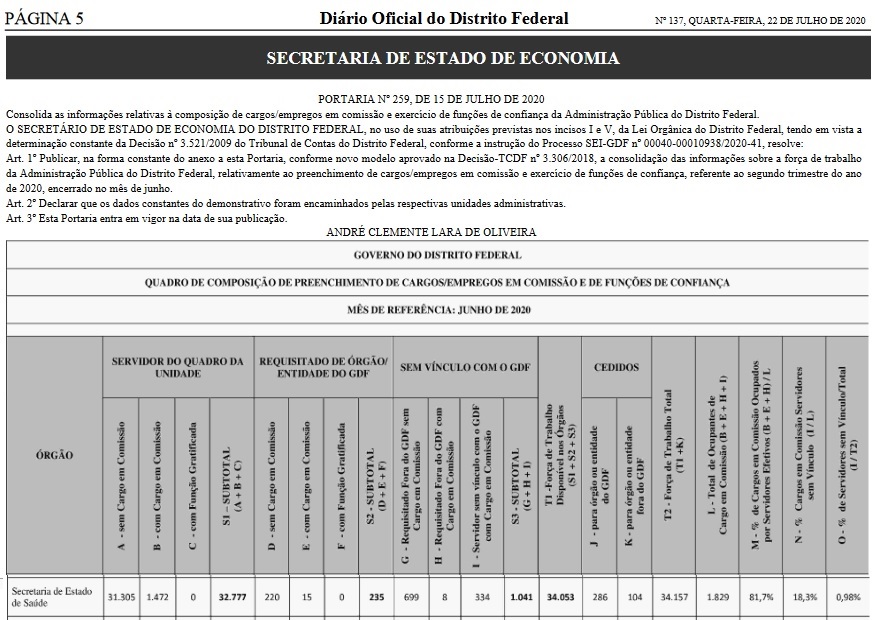 A Secretaria de Estado de Saúde do Distrito Federal (SES-DF) é a maior empregadora do Governo do Distrito Federal (GDF), com 34.053 servidores, os dados foram publicados na quarta-feira (22/07), no DODF.