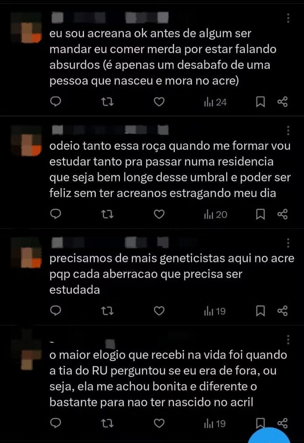 Dias depois, a estudante Assúria Nascimento de Mesquita, de 20 anos, da Universidade Federal do Acre (UFAC), usou a rede social X (antigo Twitter) para ofender os próprios conterrâneos, chamando o povo acreano de “seboso”, e dizendo que o namorado “não ser acreano” era sua melhor qualidade. Filha do secretário de Indústria, Ciência e Tecnologia do Acre, Assurbanípal Mesquita, Assúria publicou uma nota de retratação, mas a UFAC afirmou que o pedido de desculpas não basta e irá avaliar medidas institucionais.