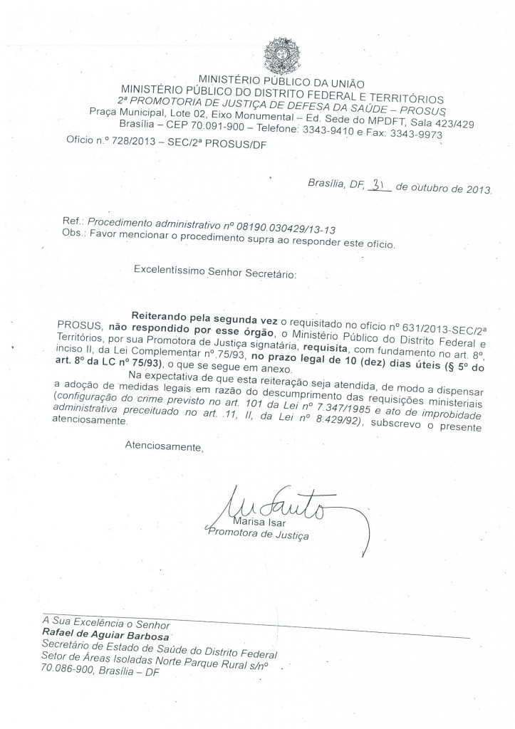 O secretário de Saúde, Rafael de Aguiar Barbosa (PT), na qualidade de agente público deixou de responder sem justificativa e em tempo hábil (reiterado) pedidos de esclarecimentos feitos pelo Ministério Público sobre a – PORTARIA Nº 228/2013-SES-DF – que autoriza apenas aos médicos fazerem 18 horas ininterruptas por plantões nas unidades hospitalares do Distrito Federal.