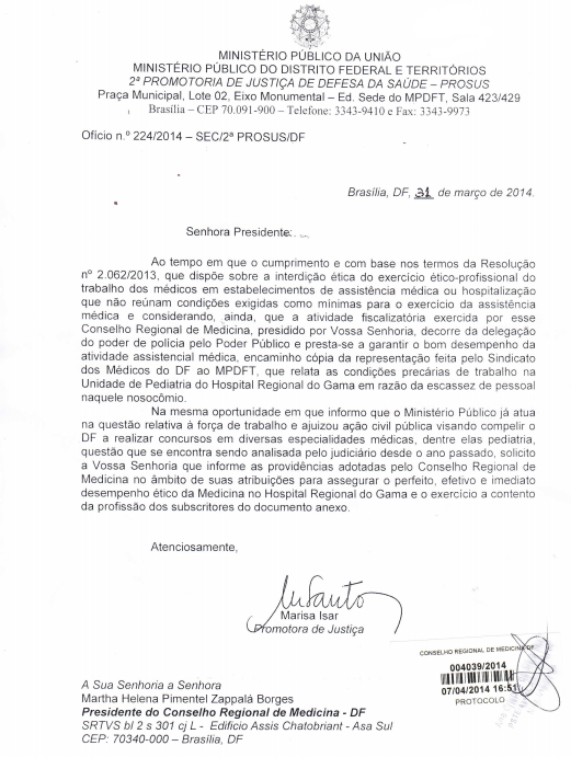 No dia 31/3, a 2ª Prosus encaminhou ao Conselho Regional de Medicina do DF representação feita pelo Sindicato dos Médicos local sobre as inadequações na Unidade de Pediatria do HRG. Os principais problemas apontados foram a falta de médicos e as condições precárias de trabalho. A entidade deverá analisar, por recomendação do Ministério Público, a pertinência de eventual interdição ética do local, em face da falta de condições para o exercício ético profissional da Medicina na área de pediatria do HRG, o que vem afetando o atendimento à população infanto-juvenil.