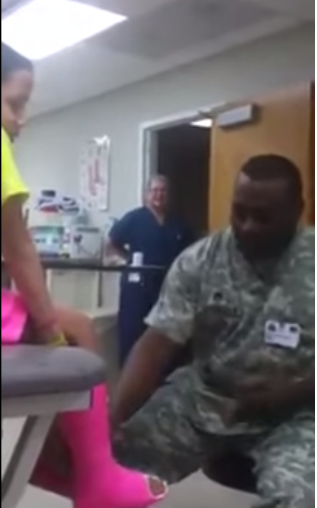 O médico militar orienta uma menina a respeito dos cuidados com o gesso em sua perna quebrada passando as informações na forma de um rap