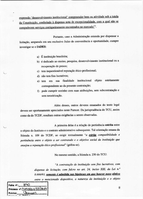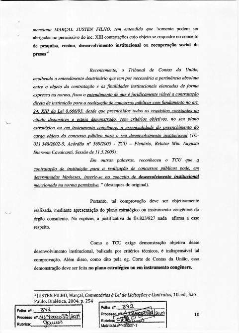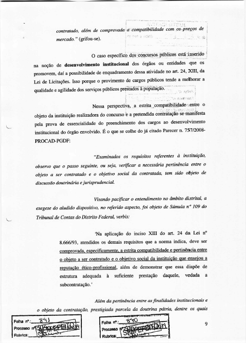 1. Necessidade de demonstração da pertinência estrita entre o objetivo social e o objeto do contrato, conforme Súmula n. 109 do TCDF e 250 do TCU. A realização de concurso público mediante a contratação direta prevista no art. 24, XIII, da Lei de Licitações reclama comprovação objetiva, em plano estratégico ou instrumento congênere, de que o certame é indispensável ao desenvolvimento institucional da entidade contratante, conforme exigência do TCU.