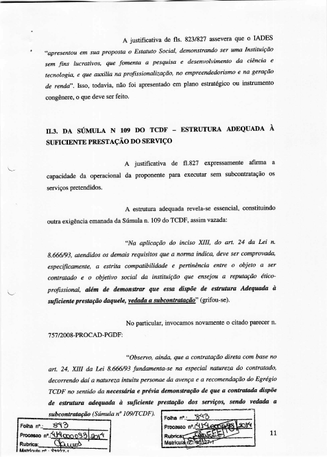2. A Súmula n° 109 do TCDF exige prova de que a instituição a ser contratada dispõe de estrutura adequada à suficiente prestação do serviço, vedada à subcontratação.