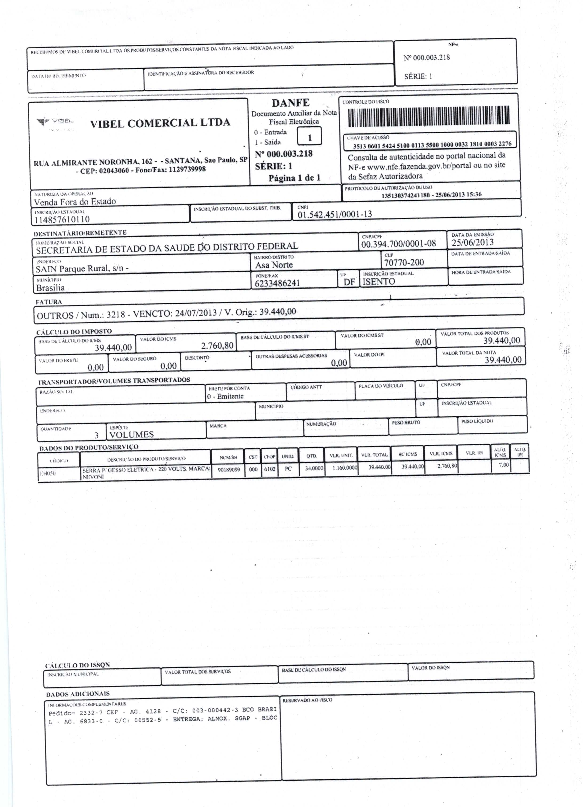 Segundo nota fiscal nos enviada por servidores da SES-DF, em relato próprio dos servidores, o superfaturamento ocorre até mesmo em contrato de serra para gesso.