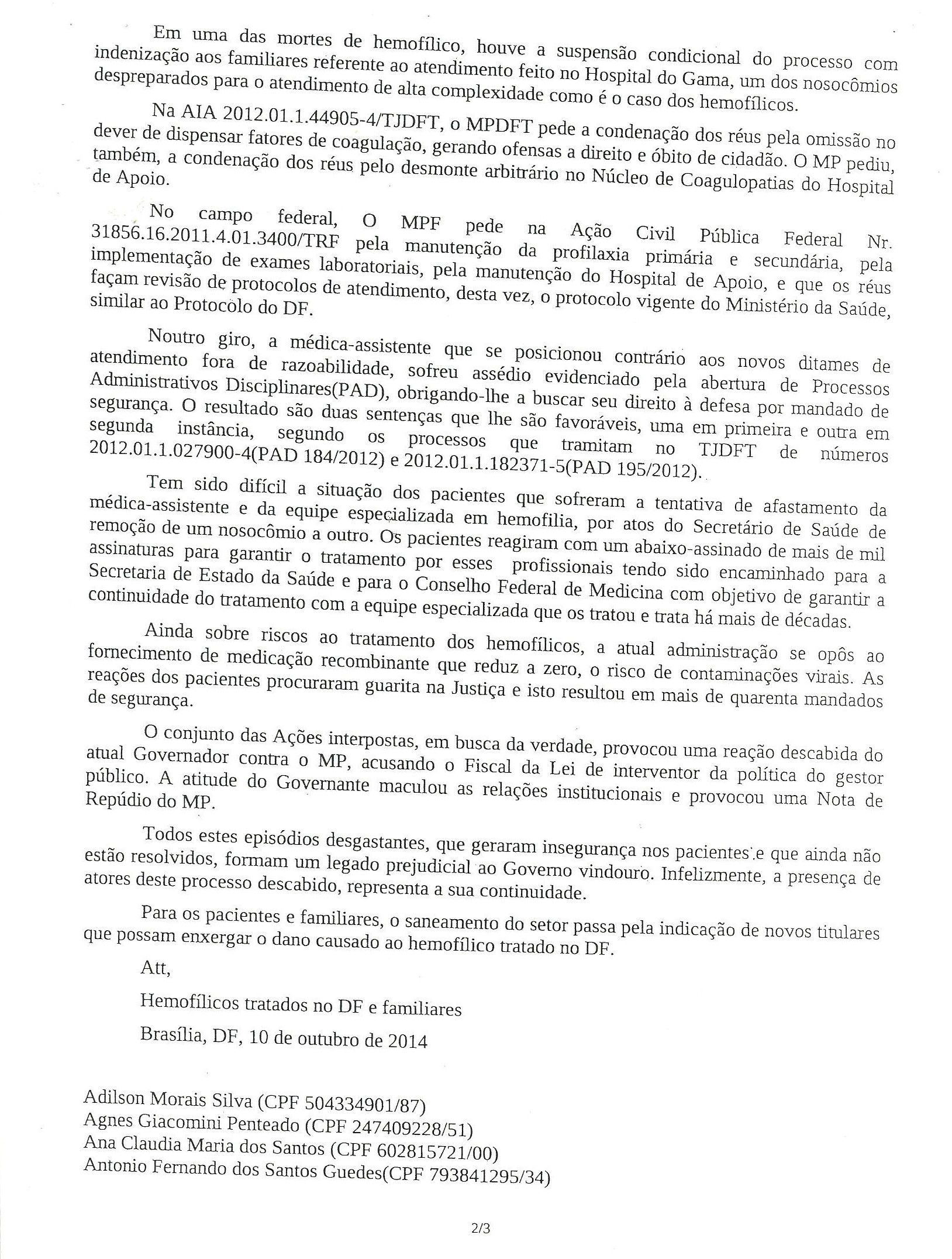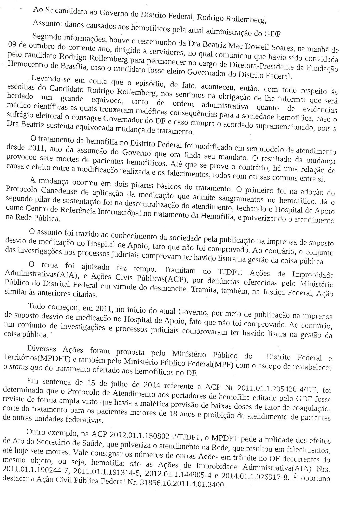 Os hemofílicos em carta (abaixo), afirmam que há uma relação de causa e efeito entre a modificação do protocolo com as mortes ocorridas – todas com causas comuns entre si.