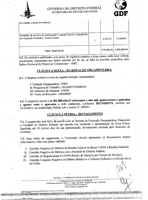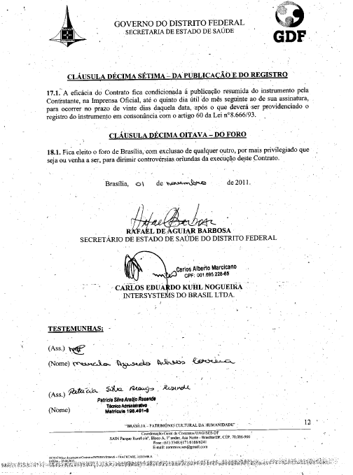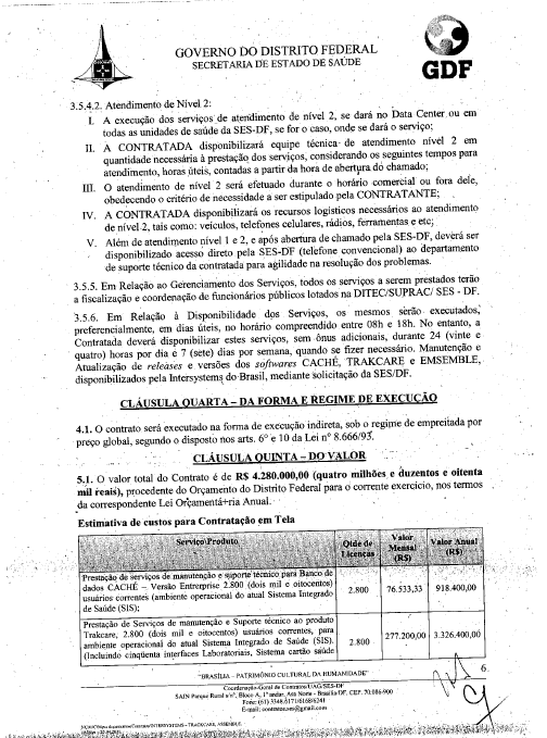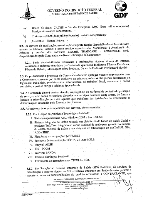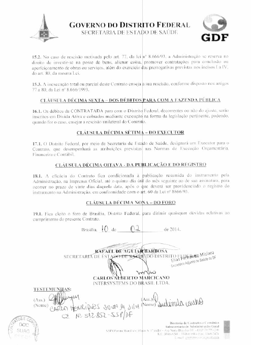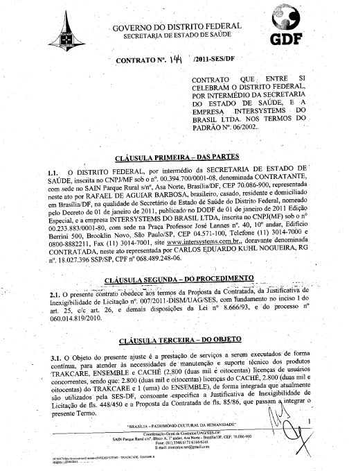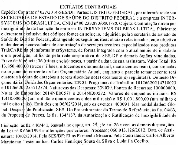 Contrariando a recomendação do MPDFT, a SES-DF firmou novo contrato com a empresa Intersystems do Brasil Ltda em 10 de fevereiro de 2014.