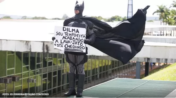 Homem vestido de Batman participa de protesto contra a corrupção na parte externa do Congresso Nacional, durante a cerimônia de posse dos novos deputados, na manhã deste domingo (1), em Brasília.