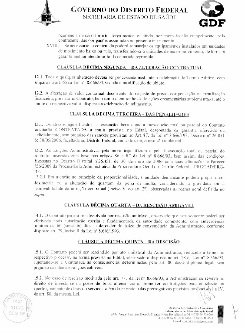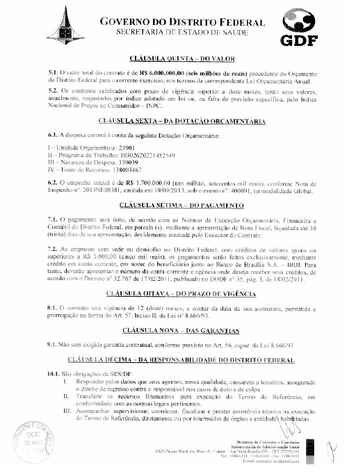 Firmado com dispensa de licitação, o Contrato nº 166/2013-SES/DF trata da reestruturação dos serviços de média e alta complexidade para atendimento de pacientes com enfermidades cardiovasculares. O Ministério Público de Contas do DF, que protocolou representação sobre o ajuste no TCDF, afirmou que houve desvio de finalidade do objeto do contrato. O ajuste previa serviços cardiológicos, mas também teria contemplado a execução de obras de engenharia e aquisição de bens.