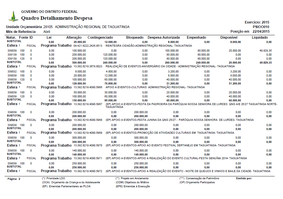 - (EP) APOIO A EVENTOS-PROMOÇÃO DE ATIVIDADES CULTURAIS EM TAGUATINGA- TAGUATINGA – 300.000,00 BLOQUEADOS;