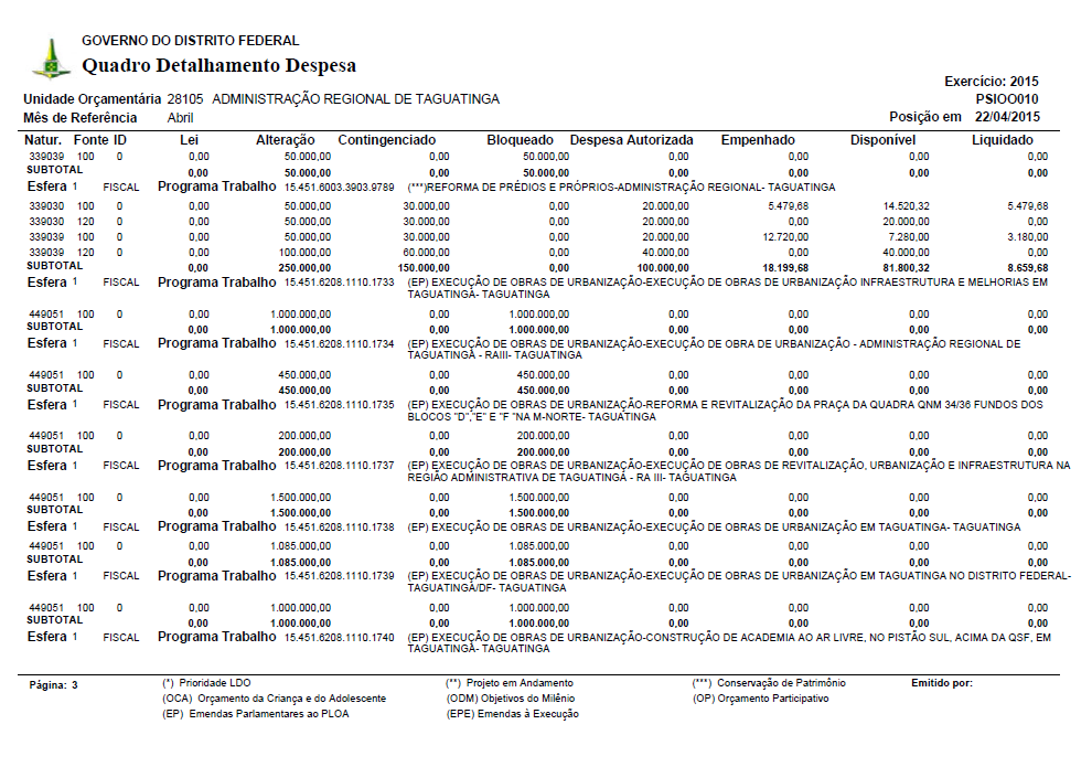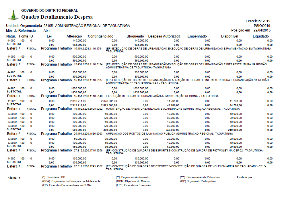 - EXECUÇÃO DE OBRAS DE URBANIZAÇÃO-ADMINISTRAÇÃO REGIONAL- TAGUATINGA – R$ 2.875.005,00 Contingenciado, R$ 44.706,00 DISPONÍVEL;