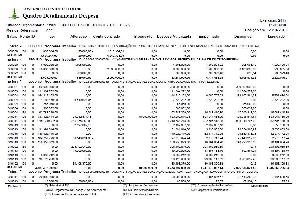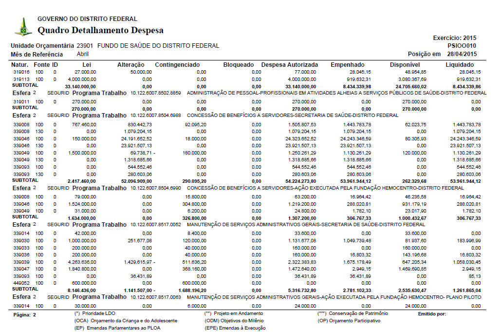 - ADMINISTRAÇÃO DE PESSOAL-SECRETARIA DE SAÚDE-DISTRITO FEDERAL – R$ 1.346.269.296,93 Liquidados;