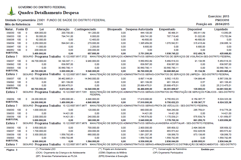 - MANUTENÇÃO DE SERVIÇOS ADMINISTRATIVOS GERAIS-CONTRATOS DE SERVIÇOS DE LIMPEZA – SES-DISTRITO FEDERAL – R$ 34.681.922,83 Liquidados;