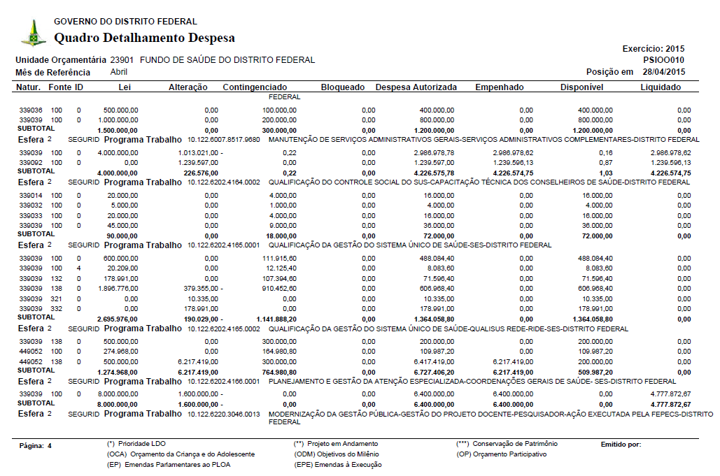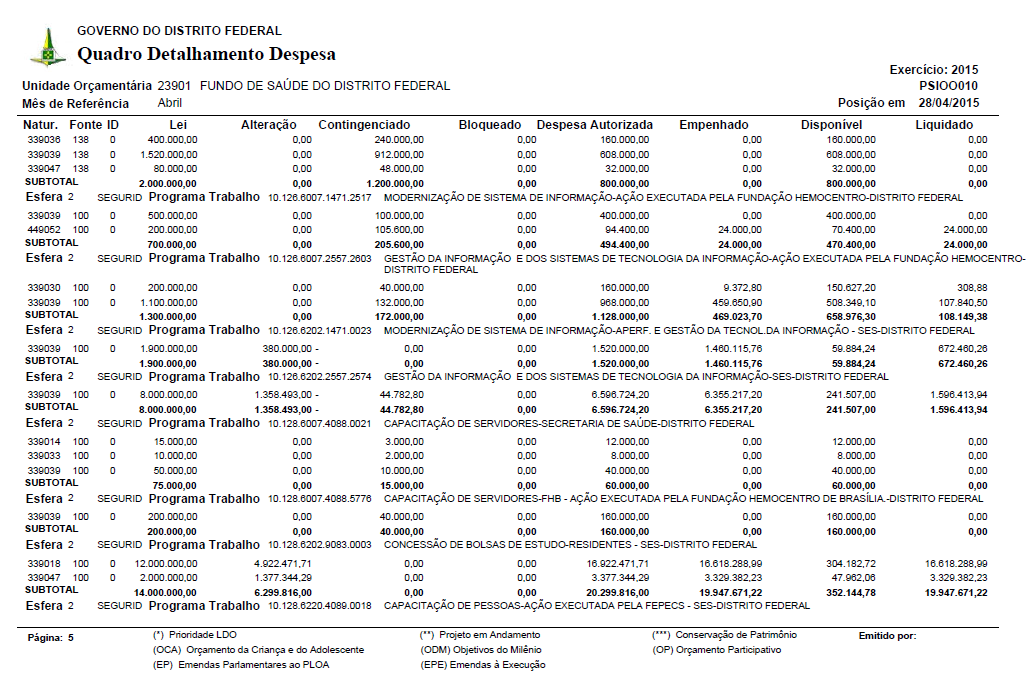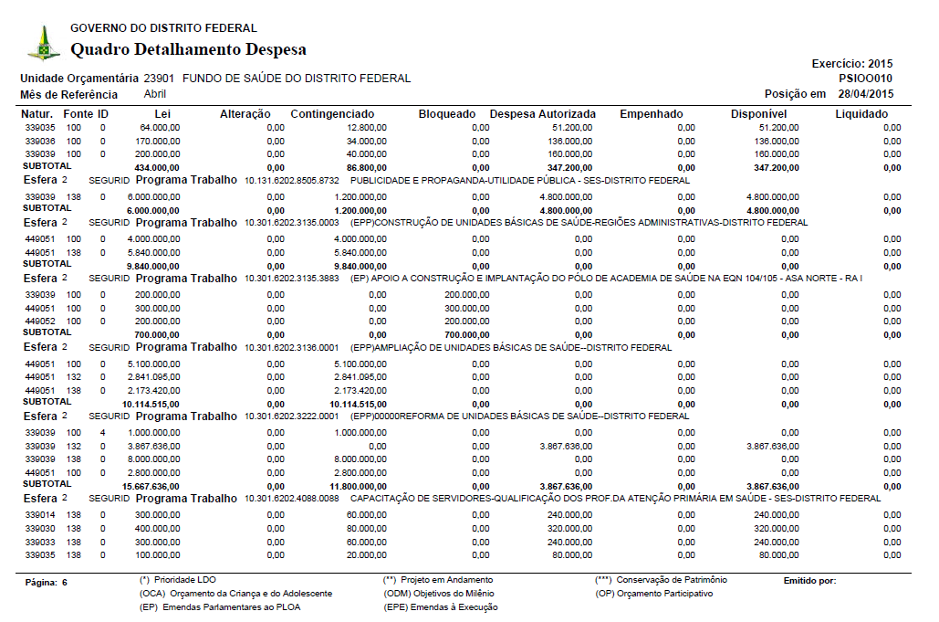 - ADMINISTRAÇÃO DE PESSOAL-PROFISSIONAIS EM ATIVIDADES ALHEIAS A SERVIÇOS PÚBLICOS DE SAÚDE-DISTRITO FEDERAL – R$ 270.000,00 Disponível;