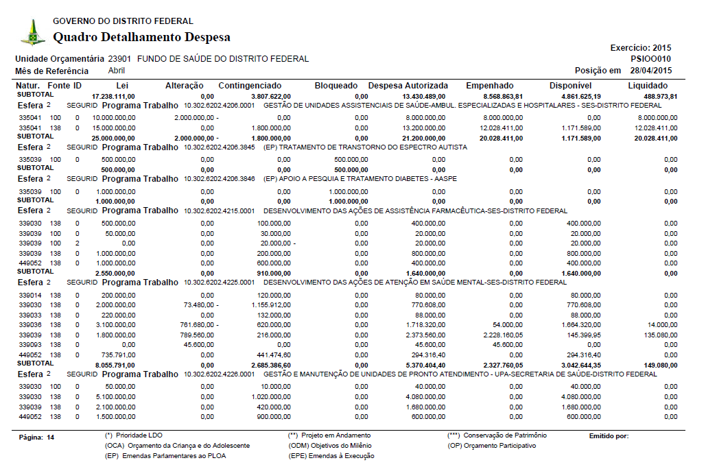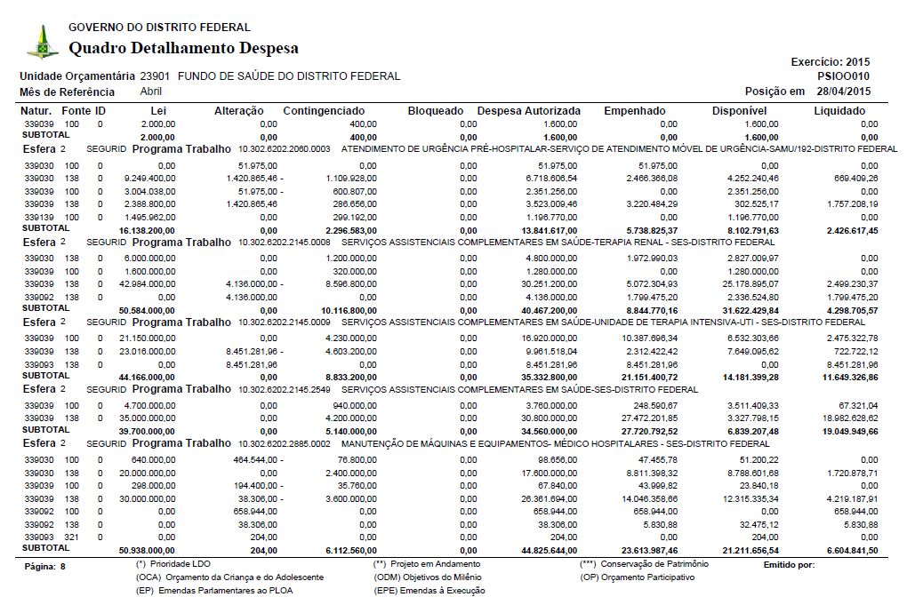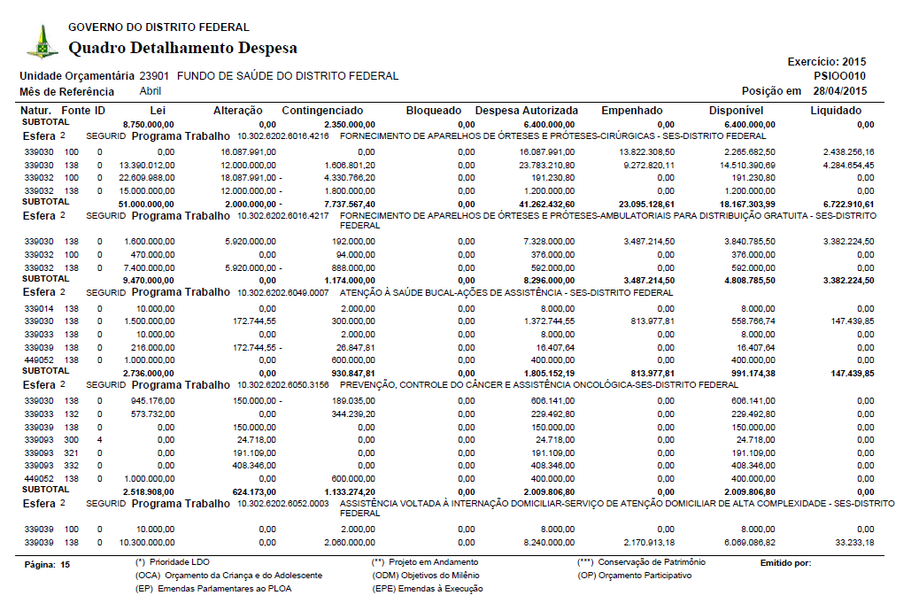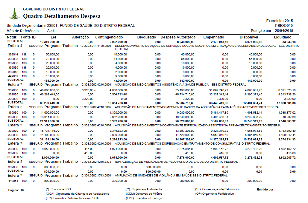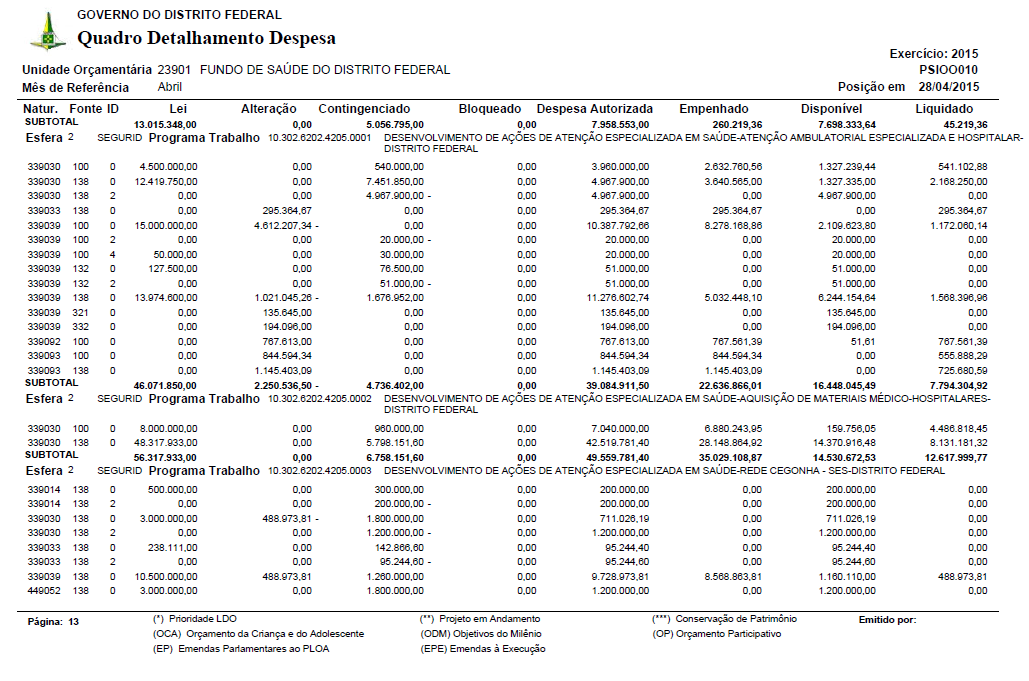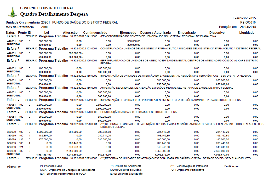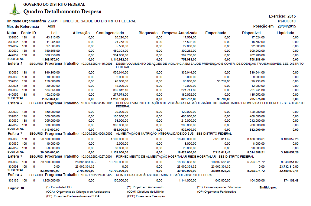 - DESENVOLVIMENTO DE AÇÕES DE ATENÇÃO ESPECIALIZADA EM SAÚDE-ATENÇÃO AMBULATORIAL ESPECIALIZADA E HOSPITALAR- DISTRITO FEDERAL – R$ 46.071.850,00 LEI – R$ 16.448.045,49 DISPONÍVEL – R$ 7.794.304,92 LIQUIDADO;