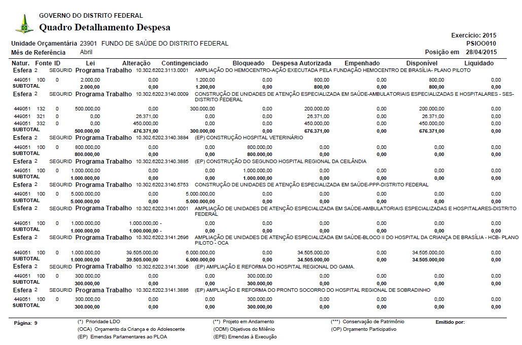 - (EP) CONSTRUÇÃO DO SEGUNDO HOSPITAL REGIONAL DA CEILÂNDIA – R$ 1.000.000,00 BLOQUEADO;