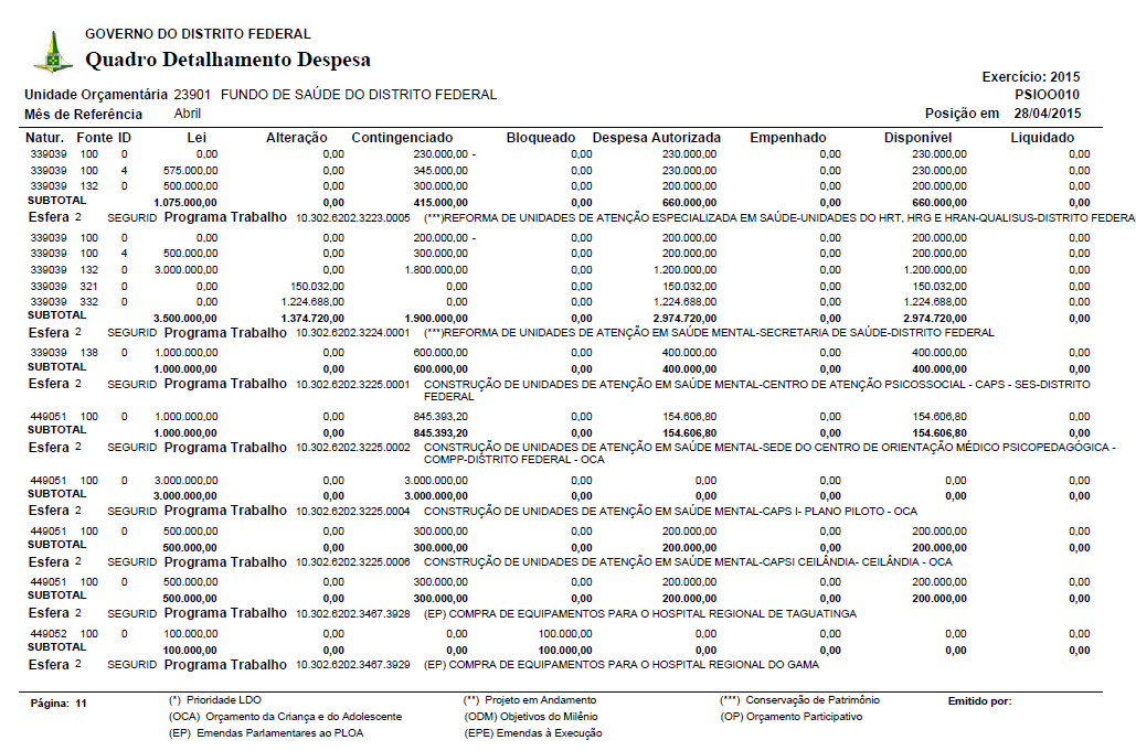 - AMPLIAÇÃO DE UNIDADES DE ATENÇÃO EM SAÚDE MENTAL-SECRETARIA DE SAÚDE-DISTRITO FEDERAL – R$ 500.000,00 CONTINGENCIADO;