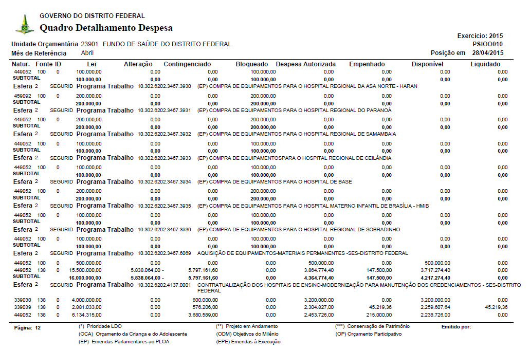 - (EP) COMPRA DE EQUIPAMENTOS PARA O HOSPITAL REGIONAL DO PARANOÁ – R$ 200.000,00 BLOQUEADO;