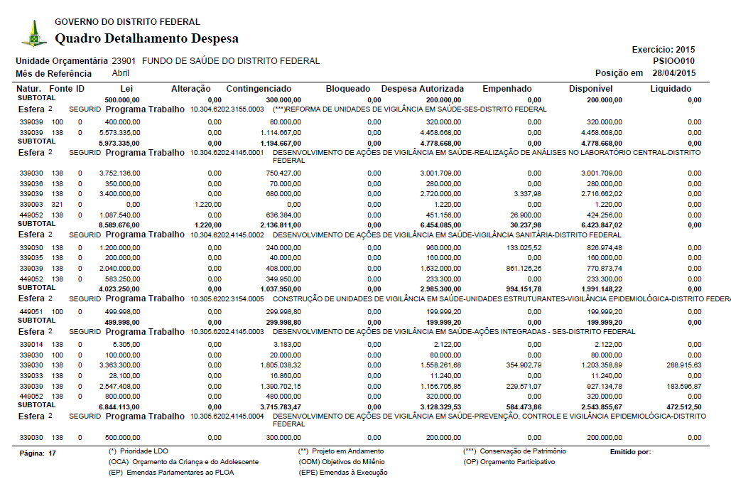 - DESENVOLVIMENTO DE AÇÕES DE VIGILÂNCIA EM SAÚDE-VIGILÂNCIA SANITÁRIA-DISTRITO FEDERAL – R$ 1.991.148,22 DISPONÍVEL DE R$ 4.023.250,00 LEI;