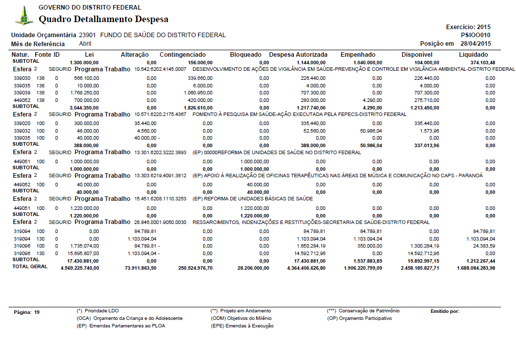 - SERVIÇOS ASSISTENCIAIS COMPLEMENTARES EM SAÚDE-SES-DISTRITO FEDERAL – R$ 39.700.000,00 LEI – R$ 6.839.207,48 DISPONÍVEL – R$ 19.049.949,66 LIQUIDADO;