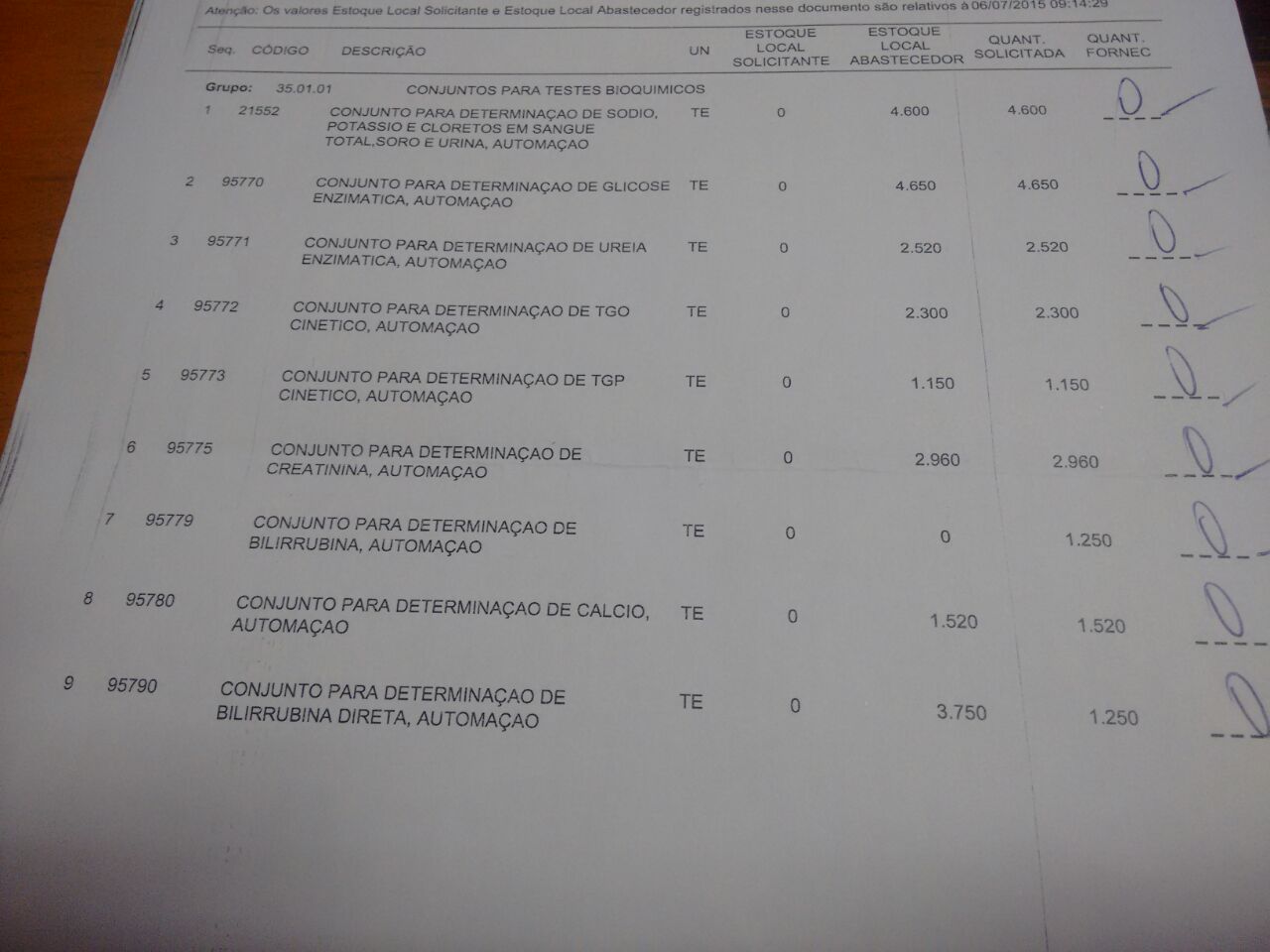 De acordo com o servidor da saúde que me enviou a lista, estão faltando conjuntos para testes bioquímicos, tais como: para determinação de sódio, potássio e cloretos em sangue total, soro e urina; glicose enzimática, ureia enzimática; TGO Cinético; TGP Cinético; Creatinina; Bilirrubina; Cálcio e Bilirrubina direta. Estes exames detectam as mais variadas doenças.