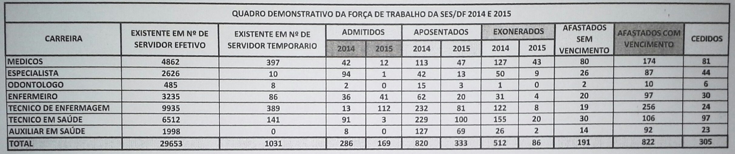 Há hoje na Secretaria de Estado de Saúde do Distrito Federal um déficit enorme de RH, também observa-se, o descaso com o dimensionamento da força de trabalho, causando uma falsa necessidade de mais RH para certas áreas, o que, poderia ser resolvido com um bom dimensionamento da força de trabalho, trazendo com isso uma grande economia com gastos com horas extras aos cofres da pasta.