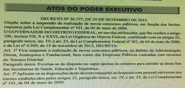 Por Callado – O Diário Oficial desta quarta-feira (30) traz hoje na seção Atos do Poder Executivo o Decreto nº 36.777, de 29 de setembro de 2015, que dispõe sobre a suspensão da realização de novos concursos públicos, me função da Lei Complementar nº 101, de 4 de maio de 2000.