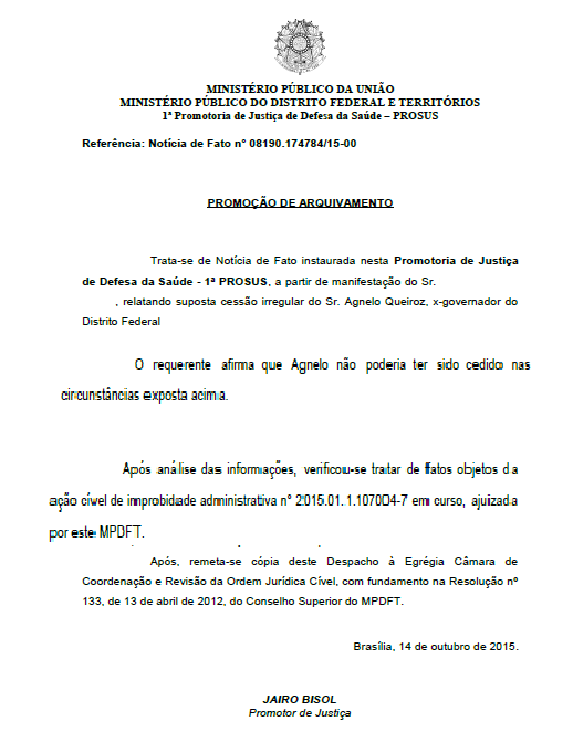 O Ministério Público abriu processo por improbidade administrativa número 2015.01.1.107004-7 em que solicita a responsabilização dos responsáveis por tal descumprimento na cessão do ex-governador Agnelo Queiroz para a UNA-SUS da Fundação Oswaldo Cruz – FIOCRUZ, com ônus para os cofres do GDF.