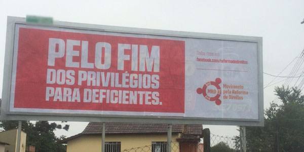 Internautas e ouvintes procuraram a Banda B na manhã desta segunda-feira (30) para mostrar indignação com um outdoor colocado na Rua Santa Cecília, no bairro Vista Alegre, em Curitiba. Identificando-se como Movimento pela Reforma de Direitos, o grupo, ou apenas uma pessoa, pede o fim dos privilégios para deficientes.