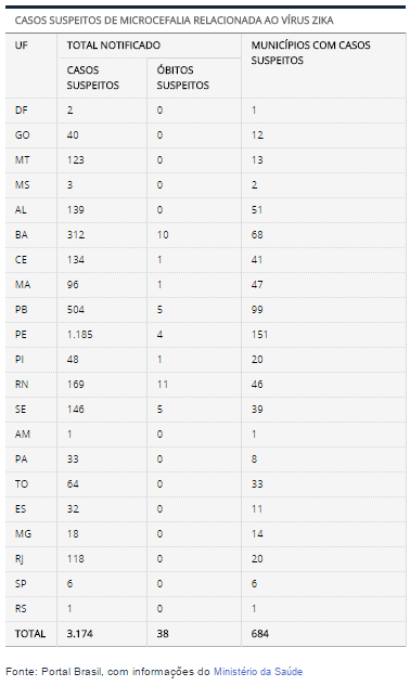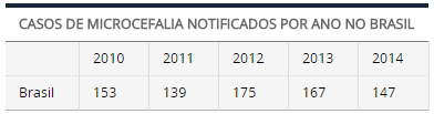 CASOS DE MICROCEFALIA NOTIFICADOS POR ANO NO BRASILO Ministério da Saúde divulgou nesta terça-feira (5) o primeiro informe epidemiológico de 2016 sobre os casos suspeitos de microcefalia relacionada ao vírus Zika. As informações são referentes aos dados até o dia 02 de janeiro. Desde o início das investigações, foram notificados 3.174 casos suspeitos da doença em recém-nascidos de 684 municípios de 21 unidades da federação.