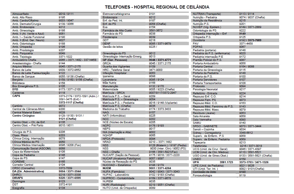 Se você chegou até nossa página na internet, em busca dos telefones do Hospital Regional de Ceilândia – HRC, que estão todos logo abaixo, é porque rico não és; não tem plano de saúde, não tem filhos em colégio particular, ganha salário mínimo, um sobrevivente as mazelas do Brasil.