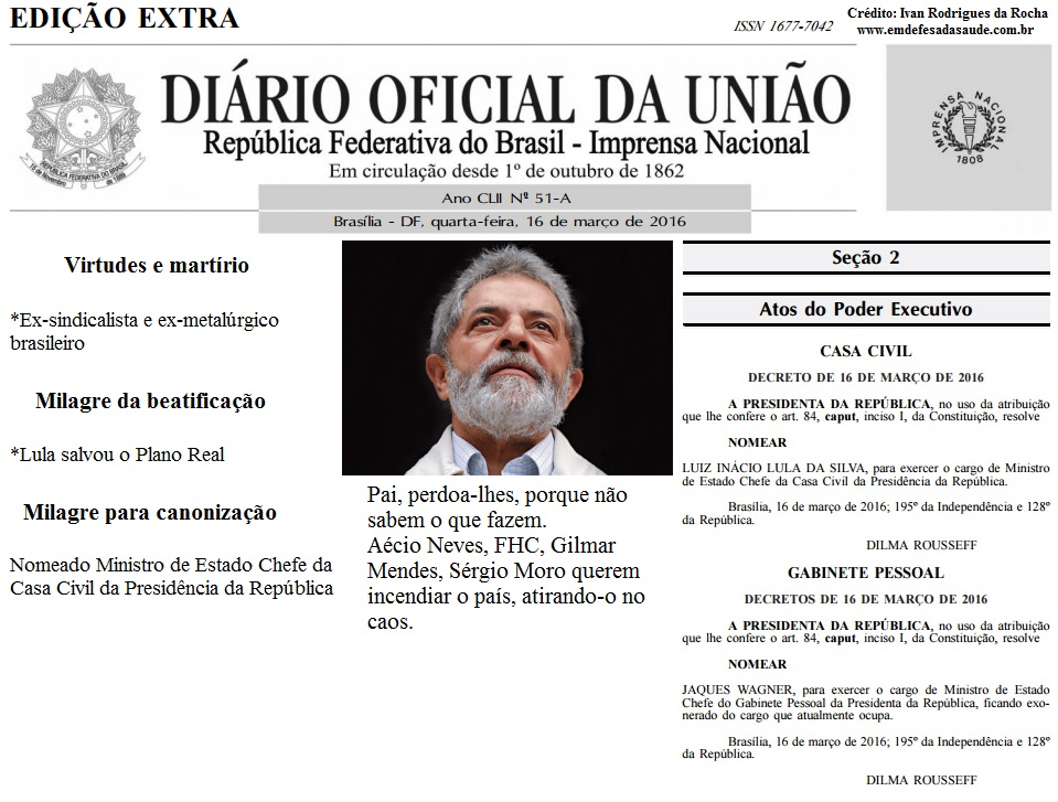 O juiz Sérgio Moro promove a canonização do ex-metalúrgico, Luiz Inácio Lula da Silva, com ações enviesadas com um pouco de Fernando Henrique Cardoso, Gilmar Mendes e Aécio Neves com a sutileza de um golpe, com efeitos de uma grande guerra civil.