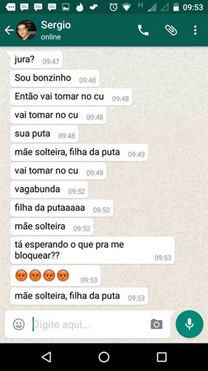 Senhor Sergio, se és tão macho assim, aliás covarde que é, para humilhar uma mulher, vamos conversar pessoalmente! São homens como você que matam mulheres todos os dias.
