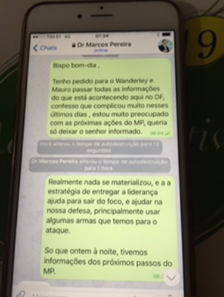 “Bispo, bom dia. Tenho pedido para o Wanderley e Mauro passar todas as informações do que está acontecendo aqui no DF, confesso que complicou muito nesses últimos dias, estou muito preocupado com as próximas ações do MP, queria deixar o senhor informado”, diz Júlio César a Marcos Pereira. “Realmente, nada se materializou e a estratégia de entregar a liderança ajuda para sair do foco, e ajuda na nossa defesa, principalmente usar algumas armas que temos para o ataque. Só que ontem à noite tivemos informações dos próximos passos do MP”.