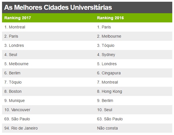 De acordo com o ranking 2017 das melhores cidades universitárias, realizado pela consultoria britância Quacquarelli Symonds (QS), trata-se de Montreal.