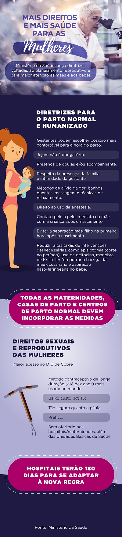 O Ministério da Saúde lança, nesta quarta-feira (8), Dia Internacional da Mulher, duas políticas que vão beneficiar as brasileiras. A primeira prioriza o parto normal e humanizado ao divulgar, pela primeira vez, diretrizes que orientam profissionais de saúde para o atendimento qualificado de mães e bebês. A outra é uma portaria que visa garantir os direitos sexuais e reprodutivos das mulheres com maior acesso ao Dispositivo Intra-Uterino (DIU) de cobre.