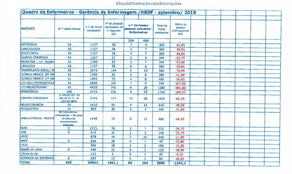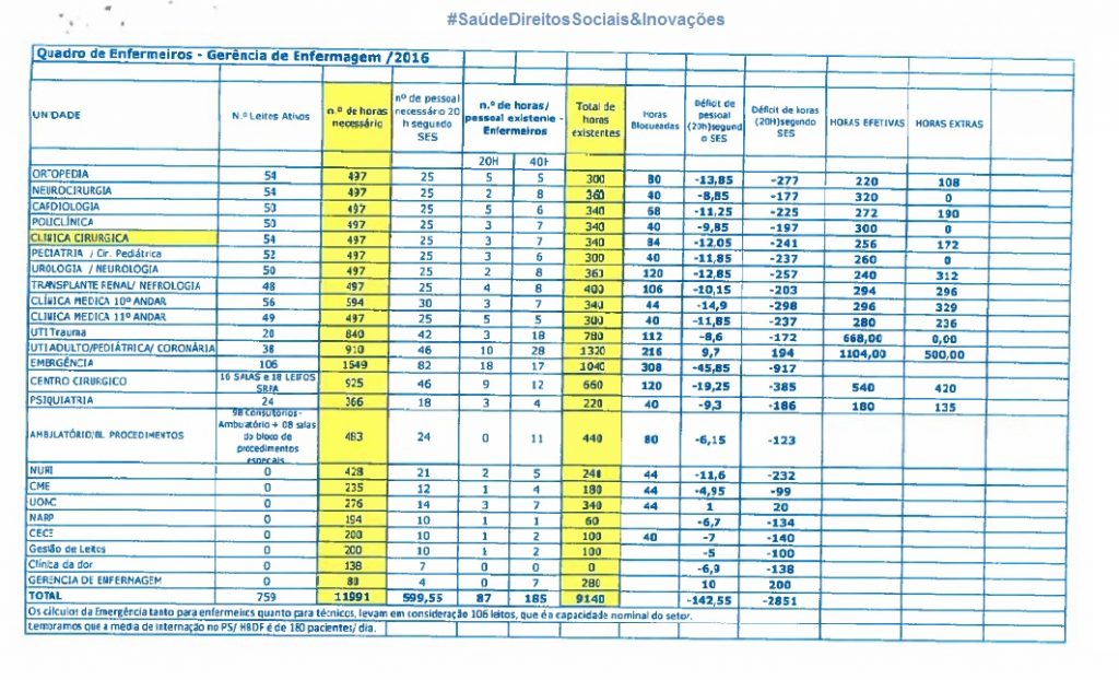 Neste dimensionamento, que foi enviado ao site por uma fonte da SES-DF, estão colocando um técnico de enfermagem para praticamente [10] leitos, sem levarem em consideração o índice de segurança técnica.