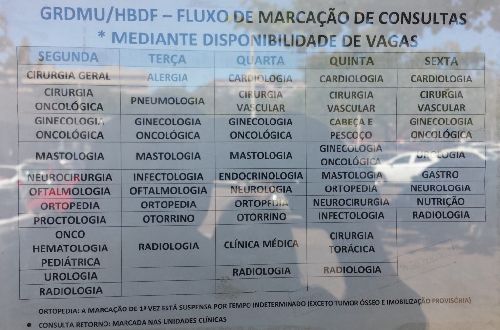A Marcação de consulta no Hospital de Base do Distrito Federal por motivo não relacionado com doença aguda, isto é, que não obrigue o atendimento imediato.