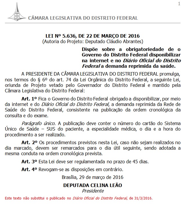 O PL 1.508/2013, que virou a (Lei 5.636/2016) é de autoria do deputado distrital Claudio Abrantes (Sem partido), passou a impor a obrigatoriedade da publicização da lista com o número do cartão do Sistema Único de Saúde (SUS) do usuário, a especialidade médica, o dia e a hora do procedimento ou atendimento a serem realizados.