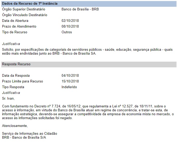 O site interpôs Recurso de 1ª Instância em 02/10/18, sobre a negativa do acesso à informação, sendo respondido em 04/10/18, pelo Serviço de Informações ao Cidadão do BRB – Banco de Brasília S/A, conforme texto integral abaixo.