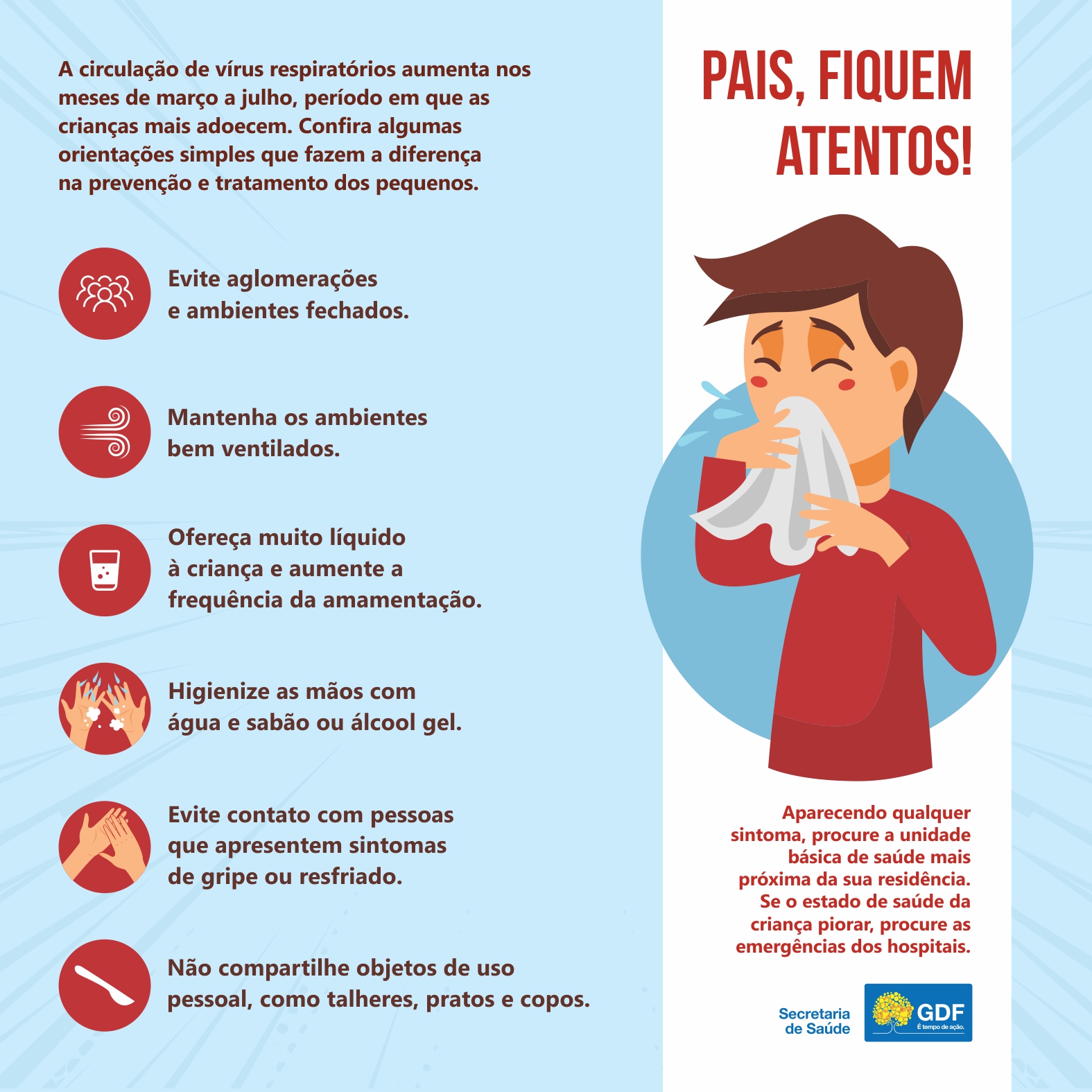 Crianças com sinais e sintomas de doenças respiratórias devem ser levadas, primeiro, às unidades básicas de saúde (UBS) mais próximas de suas casas. Como os pequenos são mais afetados pelos vírus, cuja circulação aumenta entre março e julho, época da sazonalidade das doenças respiratórias infantis, somente os casos mais graves devem ser levados para os hospitais.