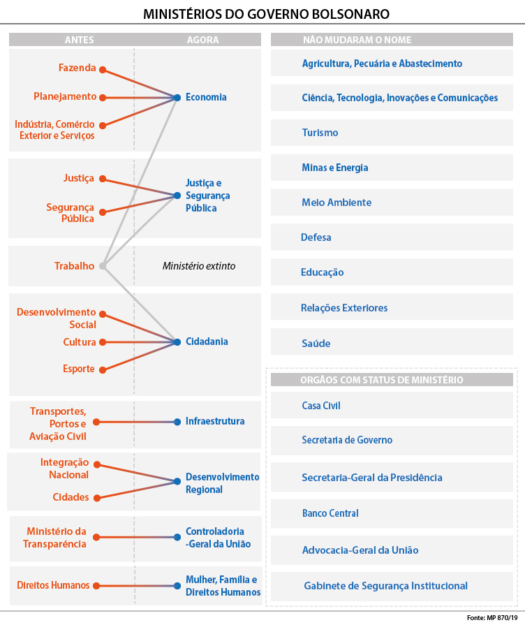 A MP 870, a primeira editada pelo governo de Jair Bolsonaro, reduz de 29 para 22 o número de órgãos com status ministerial no governo federal. São 16 ministérios, 4 secretarias vinculadas à Presidência da República (Casa Civil, Secretaria de Governo, Secretaria-Geral e Gabinete de Segurança Institucional), além do Advogado-Geral da União (AGU) e do presidente do Banco Central.