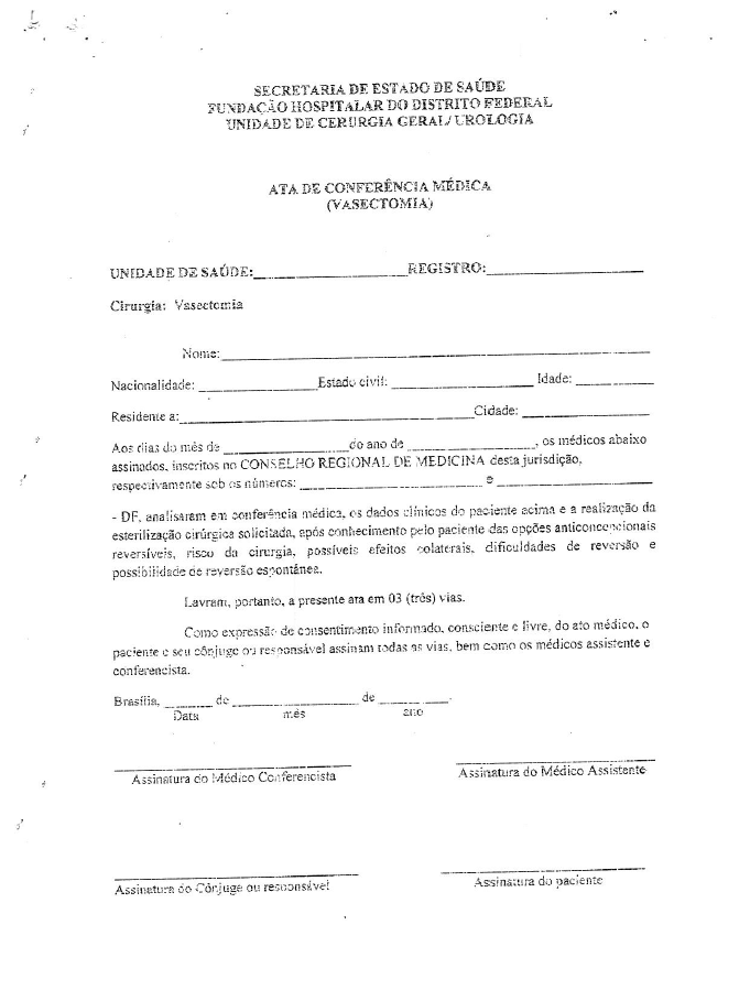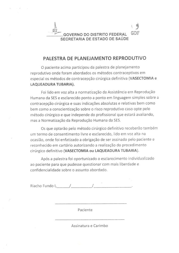 Na Equipe de Saúde da Família (ESF) na própria (UBS) – o homem terá que participar de uma palestra de – Planejamento Reprodutivo – onde serão abortados os métodos contraceptivos em especial os métodos de contracepção cirúrgica definitiva – Vasectomia e Laqueadura Tubaria.