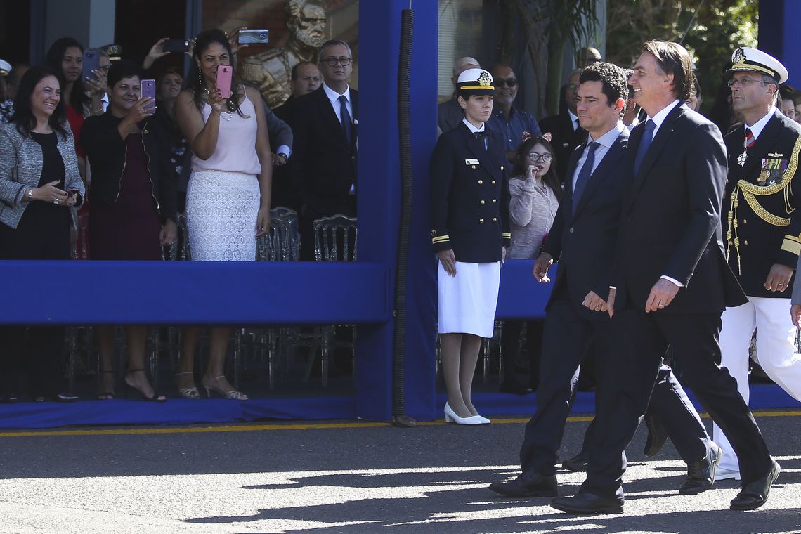 Na cerimônia na Marinha, Sérgio Moro foi homenageado com a medalha Ordem do Mérito Naval, a mais alta condecoração da Armada brasileira. O ministro e o presidente permaneceram o tempo todo sentados lado a lado. Mais 13 ministros foram ao evento, entre eles Onyx Lorenzoni (Casa Civil), Paulo Guedes (Economia) e Damares Alves, da Mulher, Família e Direitos Humanos.
