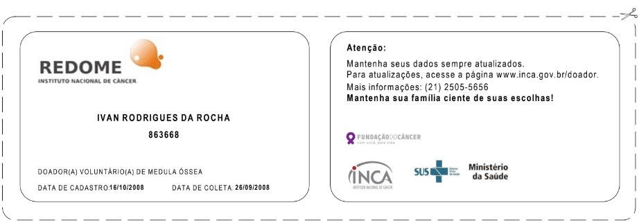 Agora, você está recebendo o seu Cartão de Doador Voluntário de Medula Óssea. Mantenha-o sempre com você. Assim, você se lembrará de atualizar os seus dados quando houver alguma mudança em seu cadastro. Para isso, basta entrar em contato com o setor responsável por meio do e-mail ou telefone indicados no Cartão. Manter seu cadastro atualizado também possibilitará que você receba materiais informativos sobre a área de transplante de doação de medula óssea e acompanhe como este setor vem crescendo no país.