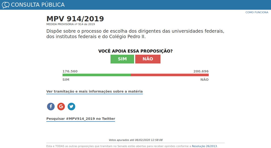 A consulta pública realizada pelo Senado Federal sobre a Medida Provisória (MPV) no 914, de 24 de dezembro de 2019, que dispõe sobre o processo de escolha dos dirigentes das universidades federais, dos institutos federais e do Colégio Pedro II pelo Executivo, mostra hoje, um placar desfavorável ao governo Bolsonaro com [176.432 SIM] e [200.314 NÃO].
