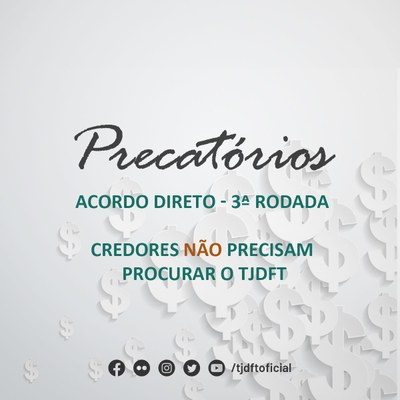 Nesta terceira rodada do Acordo Direto, foram incluídos os precatórios emitidos até 31 de dezembro de 2018, constantes da lista cronológica organizada pelo TJDFT. Pelas regras do edital, caso sejam preenchidos os requisitos legais, o pagamento será feito de forma direta, com o deságio de 40% (quarenta por cento) sobre o valor atualizado do precatório. Para apresentar proposta de acordo direto de precatório, o credor deve ser, obrigatoriamente, titular originário do precatório ou sucessor causa mortis. O interessado deve apresentar a proposta de acordo direto de pagamento no período compreendido entre o dia 03 de março de 2020 e o dia 27 de março de 2020.