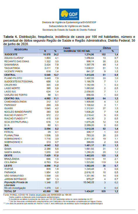 Até às 19h:50 do dia 30/06/2020, foram notificados no Distrito Federal, 49.218 casos confirmados de COVID-19 (2.147 casos novos em relação ao dia anterior). Do total de casos notificados, 37.998 (77%) estão recuperados e 587 (1,2%) evoluíram para óbito. Destes óbitos, 48são de residência de outros estados, sendo 44 de Goiás (entorno), um do Amapá, dois do Rio de Janeiro e um do Tocantins(Tabela 1). Com relação ao local de residência dos casos, 43.800 (89,0%) residem no DF e 4.173 (8,5%) residem em outras Unidades Federadas (UF), sendo que os municípios do entorno respondem pela maior proporção dos casos de outras Unidades Federativas UF.